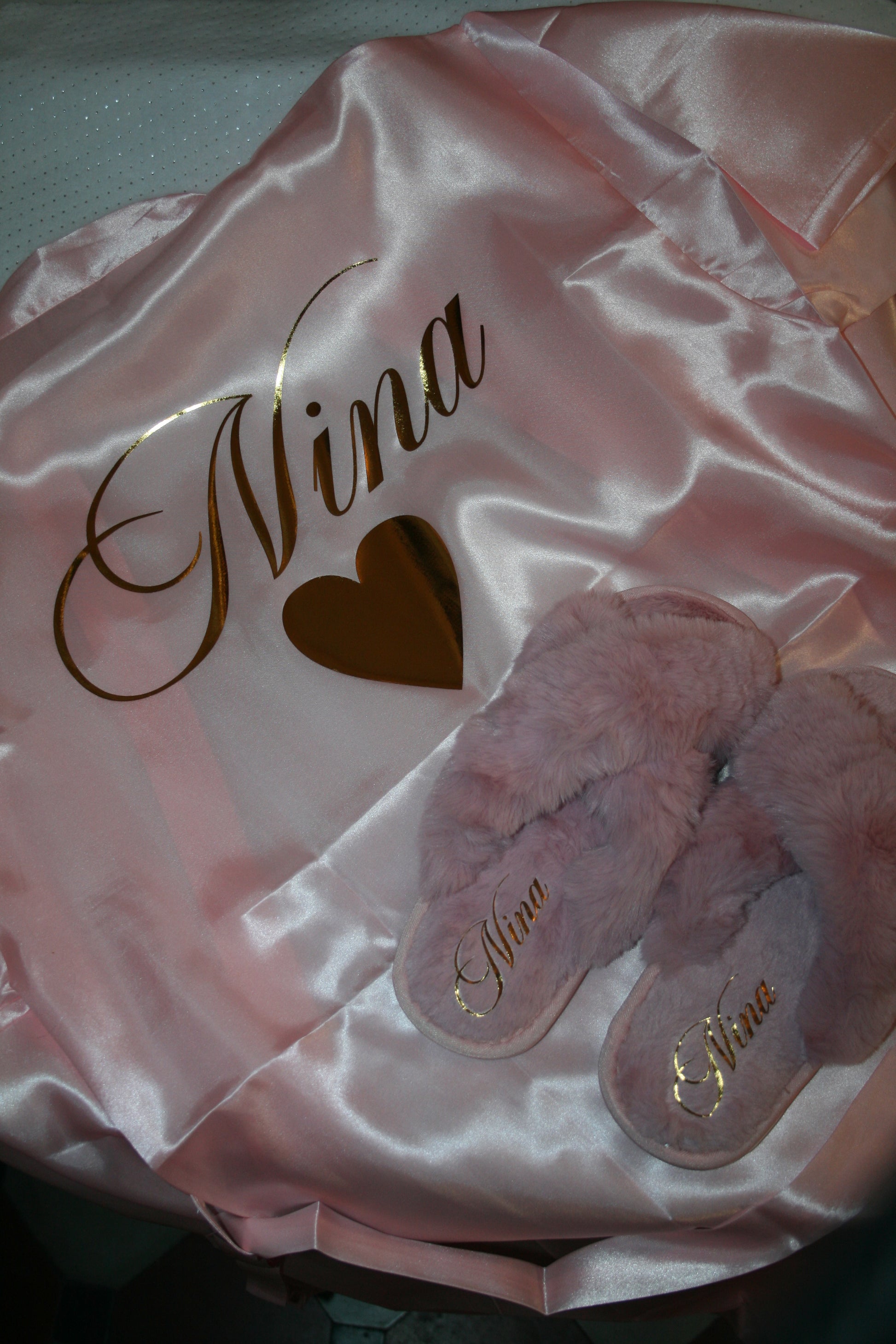 Offrez (ou offrez-vous) une pause cocooning chic avec cet ensemble personnalisé ultra tendance, composé d’un peignoir satiné rose poudré et de claquettes en fausse fourrure douce, tous deux floqués au prénom de votre choix en doré miroir ✨