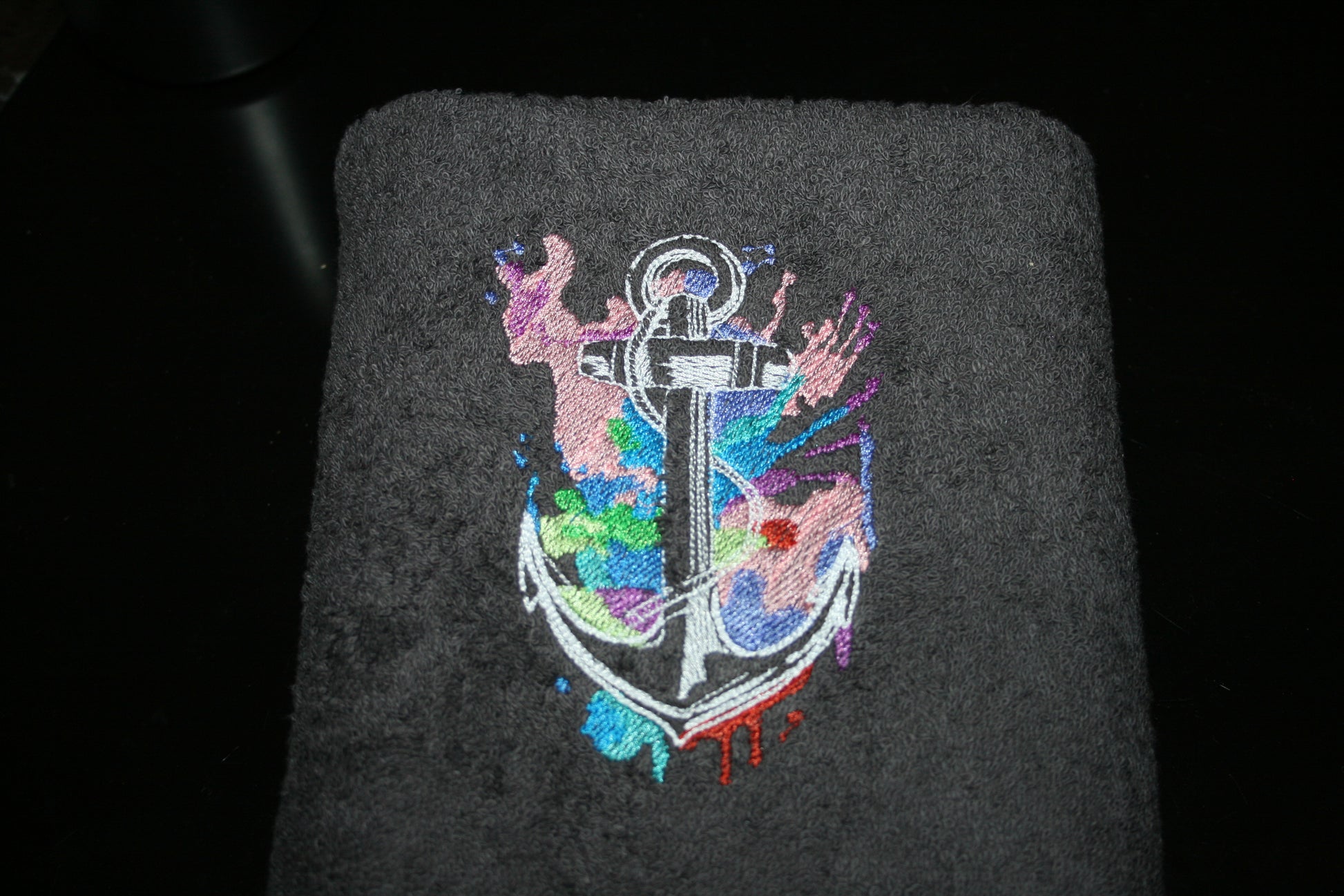 ⚓ Apportez une touche marine et artistique à votre salle de bain avec cette serviette de bain blanche sublimée d’une broderie ancre noire élégante, mise en valeur par un fond éclatant aux éclaboussures colorées façon aquarelle.
