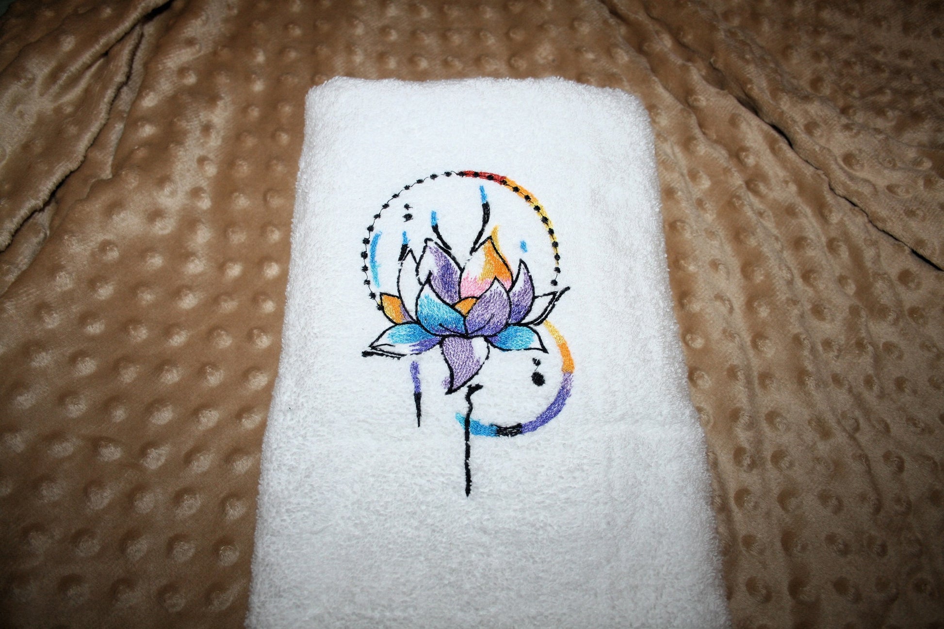 Ajoutez une touche de charme et de douceur à votre salle de bain avec cette serviette en coton de qualité supérieure, ornée d'une broderie délicate représentant une fleur de lotus entouré par un jolie cercle colorer.