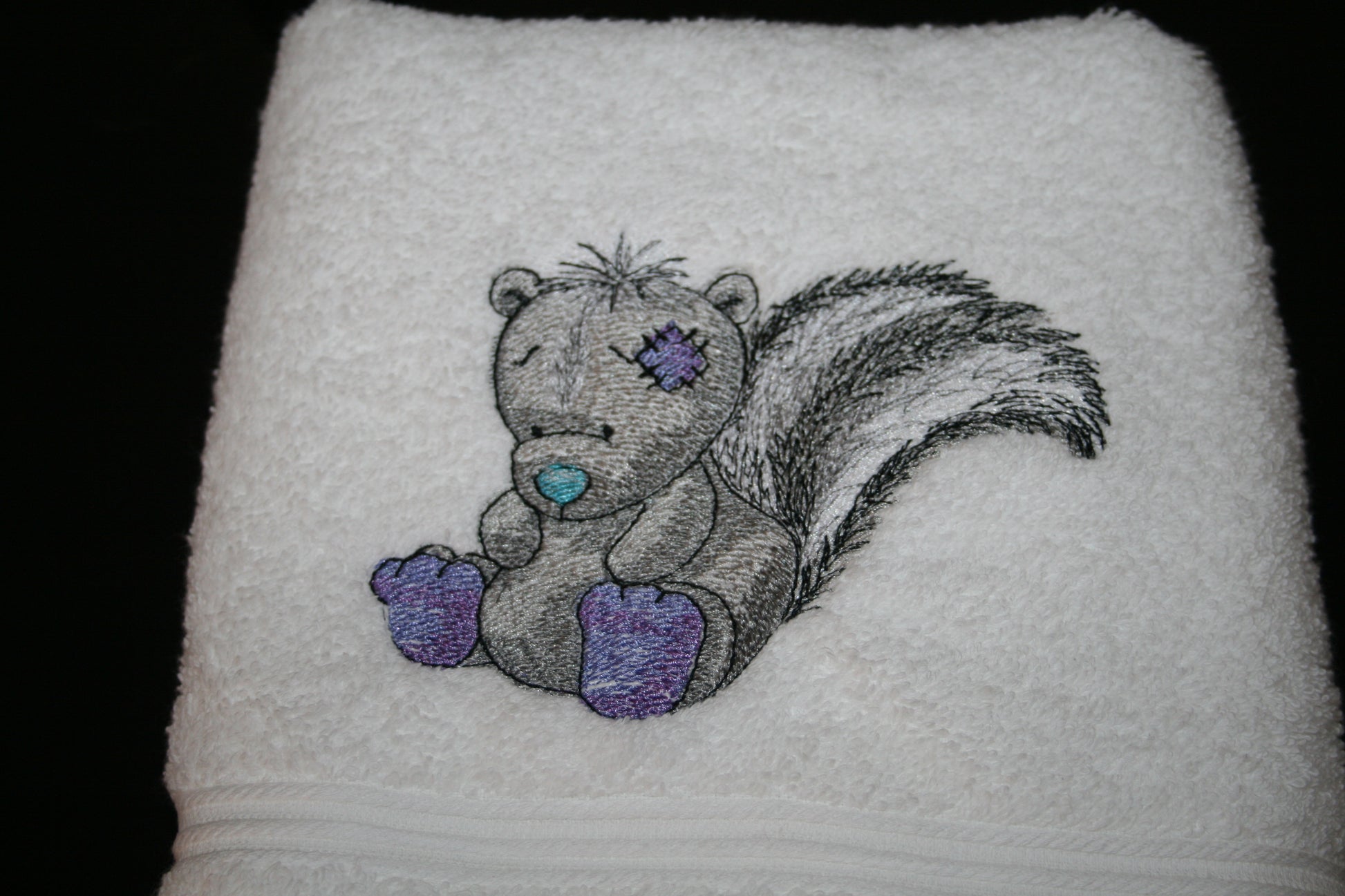 🦨💜 Apportez une touche de tendresse à votre quotidien avec cette serviette de bain blanche, délicatement brodée d’un adorable petit putois au style attendrissant. Avec ses patounes violettes, son museau bleu et son œil orné d’un patch en forme d’étoile, ce motif apporte une note douce, enfantine et pleine de charme.