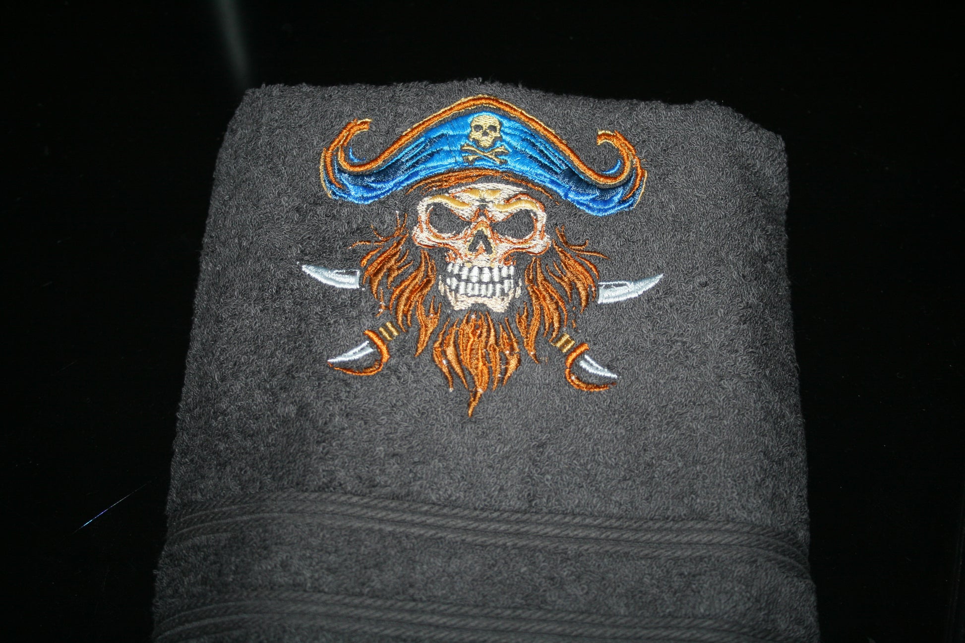 Affirmez votre style avec cette serviette en coton noir au look unique, décorée d’une broderie pirate impressionnante : un crâne barbu coiffé d’un tricorne bleu et entouré de sabres croisés. À la fois robuste et originale, elle est parfaite pour les amateurs d’aventure et de design audacieux.