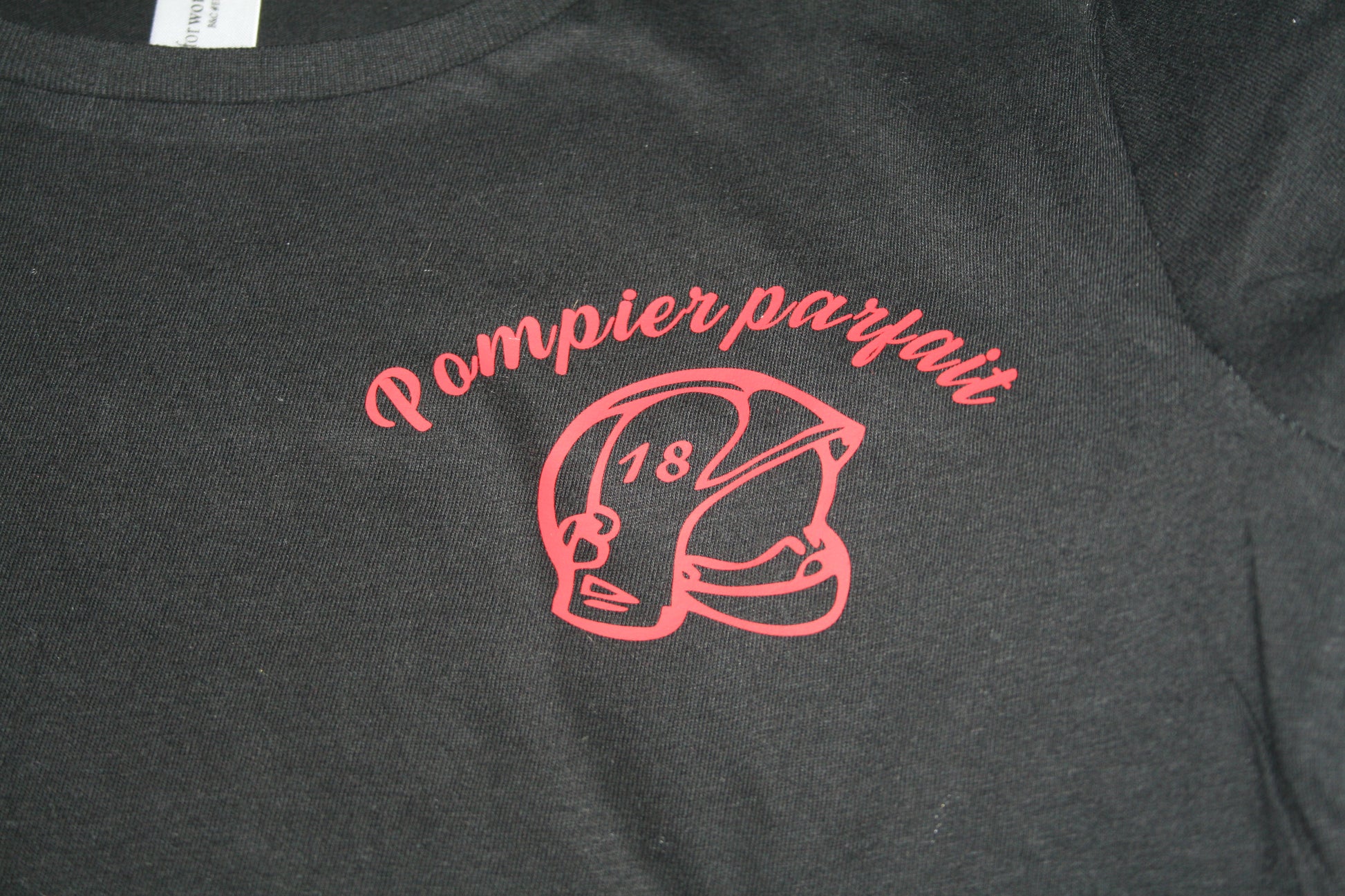 À l’avant, un design épuré avec l’inscription « Pompier parfait » accompagnée d’un casque stylisé (numéro 18 bien sûr !), et au dos un message fort et assumé :