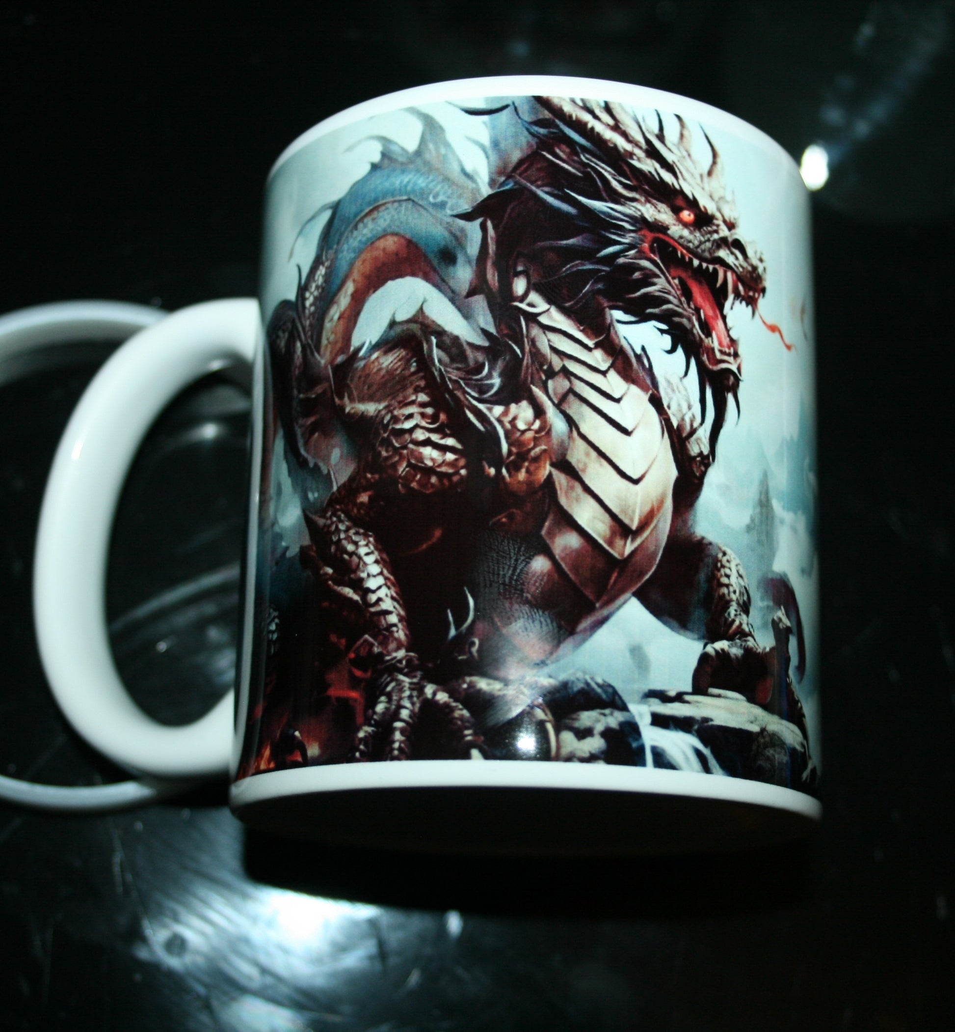 Un design puissant qui respire la force et la majesté : un dragon imposant, aux écailles d’acier et aux yeux flamboyants, rugissant au sommet des montagnes. Son allure guerrière et sa crinière de flammes font de cette tasse un symbole de puissance et de courage.
